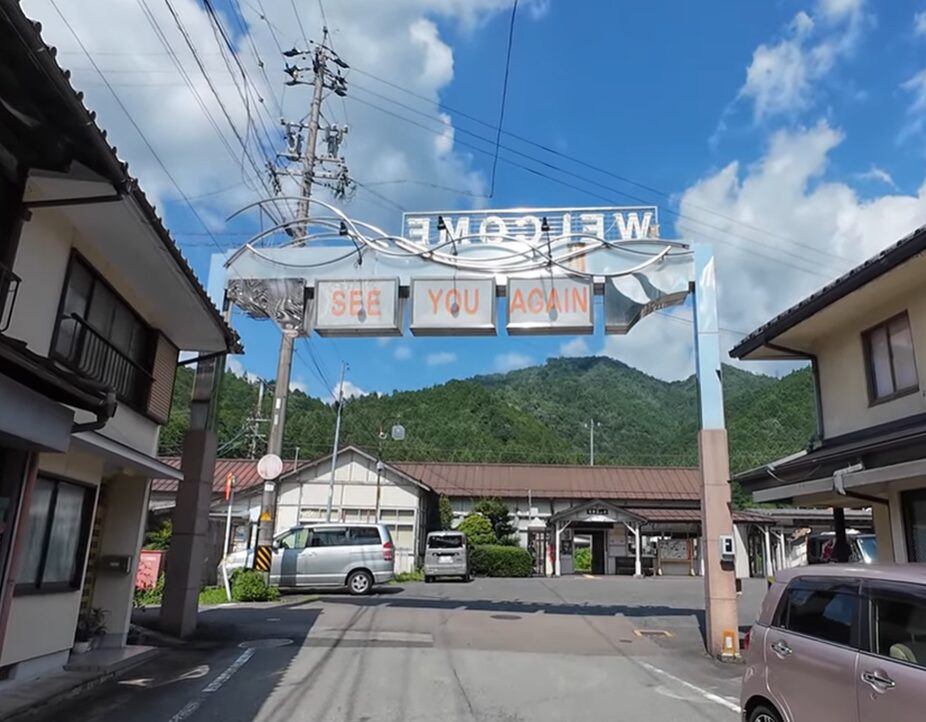 昔ながらの小さな駅で、ホームには「WELCOME」と書かれた看板が出迎えてくれます。